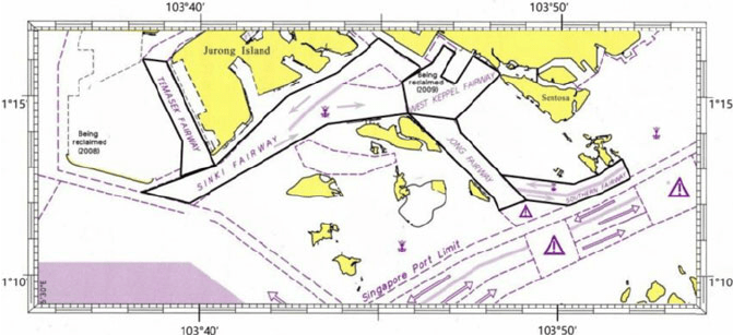 Some important fairways, left to right: Temasek Fairway, Sinki fairway, West Keppel Fairway, Jong Fairway, Southern Fairway